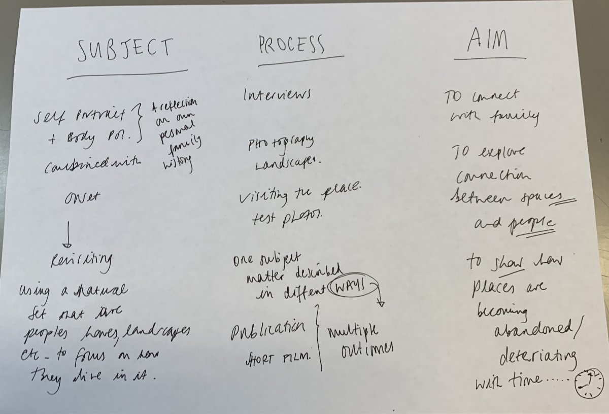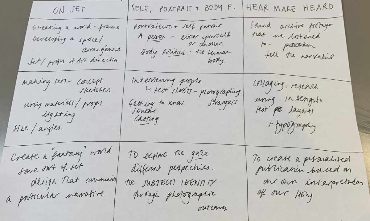 Today in groups we got together and thought about words we associated with each Part 2 project we had done, and dissected the subject, processes and aims of each brief. We then had to fill out sheets thinking about the positives of each project, and how we could develop them. At this stage, after thinking about what areas that stood out to me in each project, I am definitely leaning towards a project that combines elements of Interact, Self, Portrait and the Moving Body and Film and Moving Image.